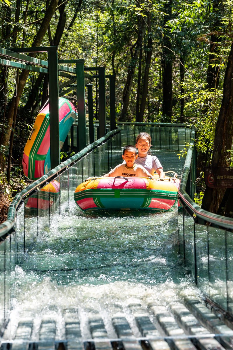 高空森林漂流:透明漂流槽架在森林上空,全程穿行于原生树林间,抬头可见枝叶交错,低头能赏林下溪流,偶尔还能遇见松鼠等小动物从槽边掠过。漂流过程中速度平缓可控,终点安全平稳停靠,适合全家一同体验林间穿梭的惬意。
